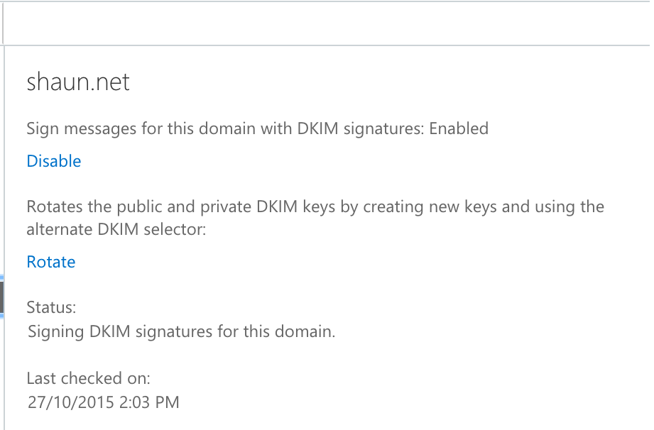 The second step was to enable DKIM signing on my domain. This isn’t yet available in the Office365 console but can be done using Powershell with Exchange Online.